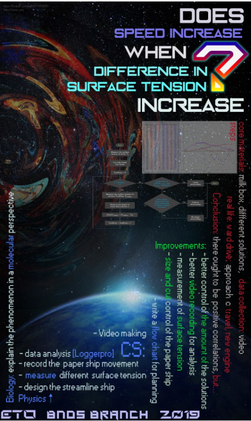 Team spirits are always shown in small details. For example, when we carried the heavy water tank from washroom to biology classroom, Lillian, Bryan, and I take turns and encourage each other along the way. One main reason that our team worked really efficiency in these 3 days is the division of labor. Lilian and Jenny are “science” student and Bryan and I are more art students, which lead to different tasks. For example, Lilian and Jenny were responsible for measuring the surface tension and Bryan and I were doing the boat design in the preparation stage. It’s worth mentioning that in the main experiment part we four worked together to conduct the experiment and record data. In the data analysis part, Jenny and I were physics specialists so we analyzed data using Logger pro and Lillian did this as well. Bryan and I also made posters and videos.
