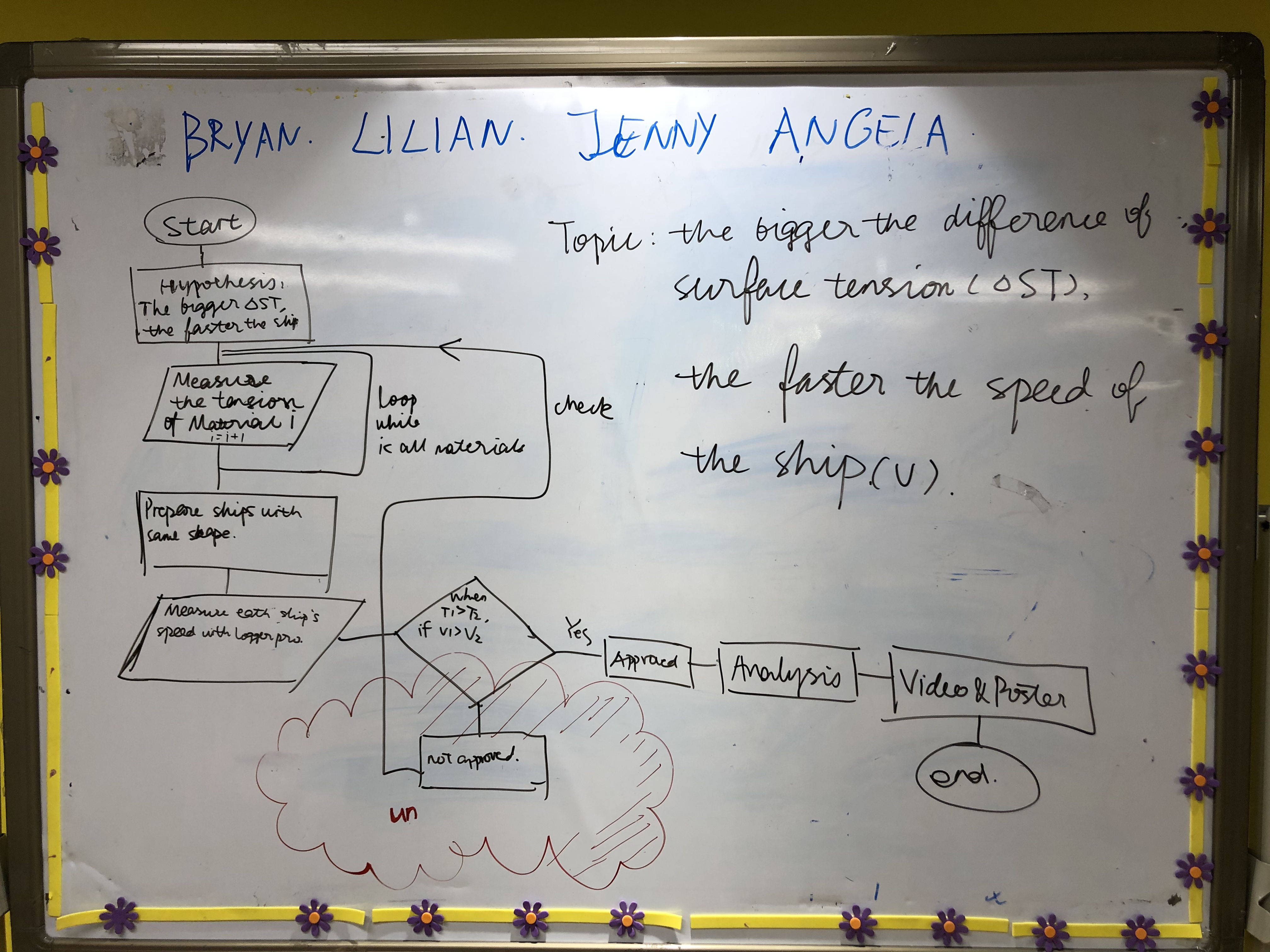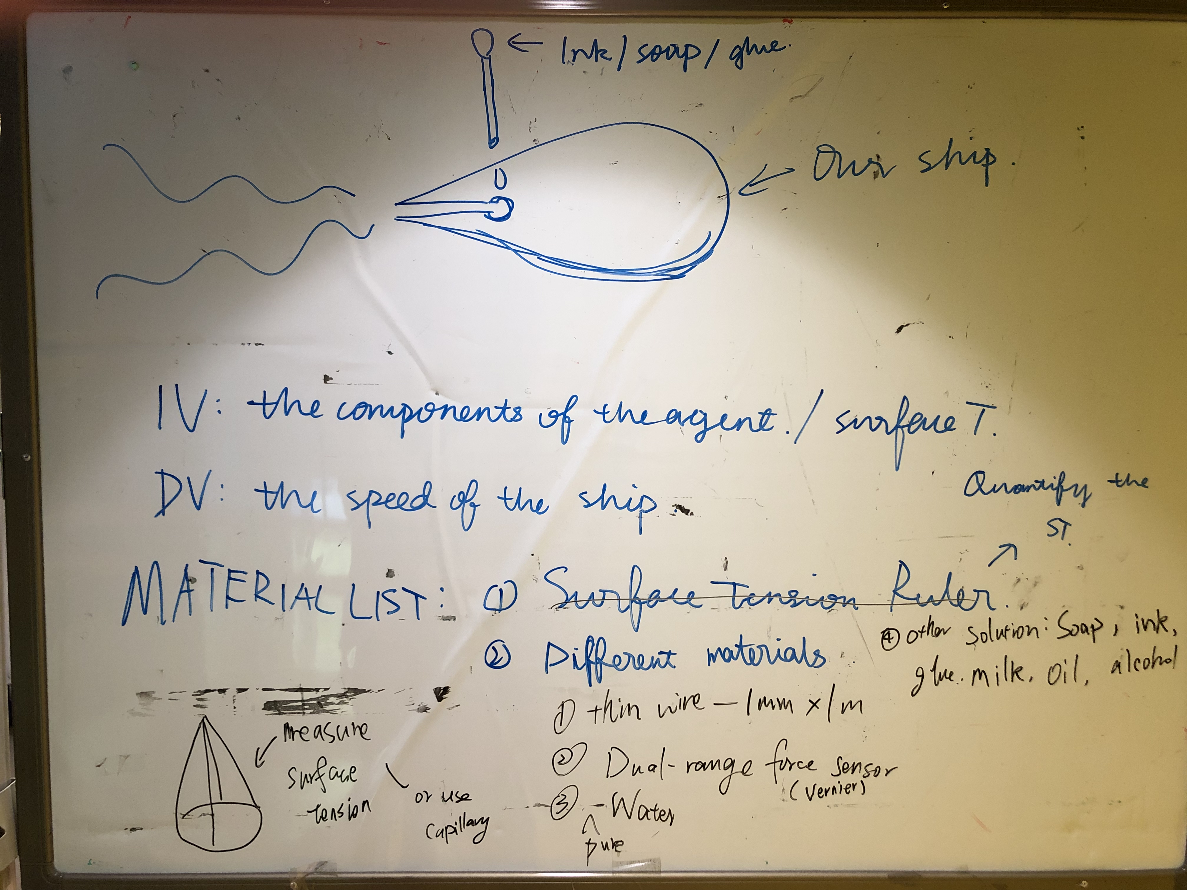 Our group’s research topic is to discover the relationship between the difference of surface tension and the velocity of the ship. We find this intriguing idea in a famous science fiction, Three Bodies, written by Cixin Liu. Some says using surface tension as energy source is unreliable while others stoutly believe the validity of this statement. Thus, in this project, we’d like to test the feasibility of it. The subject we are going to explore is closely related to the warp engine ship (driving devices in a liquid condition), which has a promising future. We have a distinct division of works to increase efficiency. Surface tension is a well-known term of Physics; thus, Jenny and I may explain it in a physics aspect. Lilian will mainly focus on the choices of solution and help with her Biology knowledge. For Bryan, he may use his understanding in CS to create the final video and presentation. With our contribution, our experiment is deliberately designed: we have reliable dependent and independent variables, clear purpose, and well-prepared material lists. The four of us have worked together smoothly so far: each of us feels a sense of belonging and feels that hir or her skills are valued. The main challenge may be the measuring of surface tension, which has a great uncertainty and hard to determine. To deal with this problem, we designed Plan A and Plan B to ensure that at least one of them is going to work and we are able to get the surface tension of different solutions. Overall, everything is carried out smoothly so far.